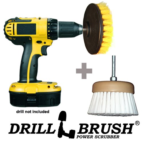 Two piece kit includes a 5 inch diameter yellow medium bristle drill powered brush and a 4 inch diameter long medium nylon bristle drillbrush. For use with any cordless drill.